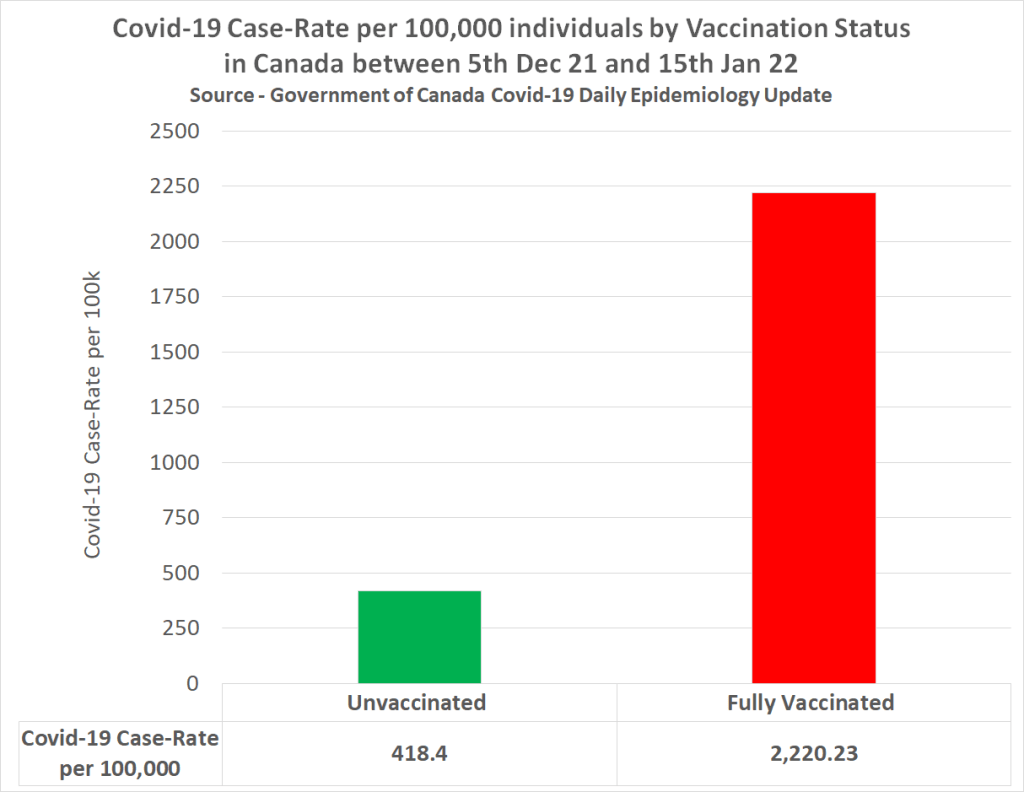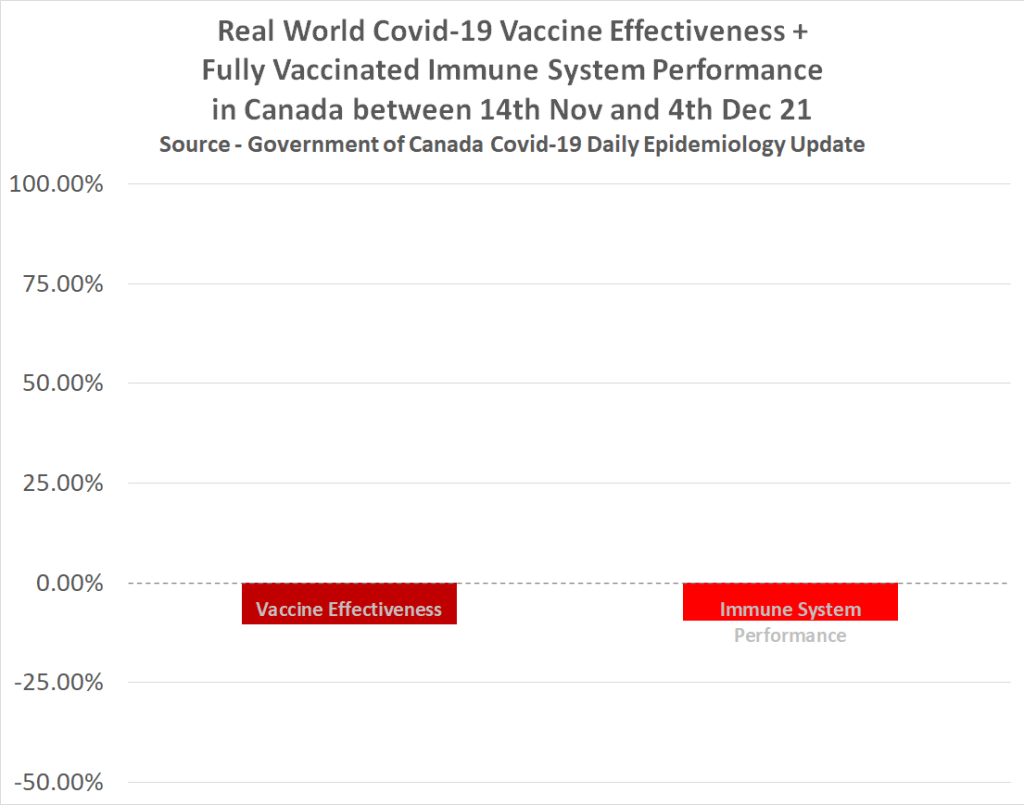 Percentage ongevaccineerden ‘gevallen’ (in Canada) – Percentage gevaccineerde ‘gevallen’ / hoogste ongevaccineerden percentage / gevaccineerden percentage = staat van het immuunsysteem. In cijfers: 418.4 – 2220.23 = 1801,83 / 2220,23 x 100 = – 81,55%. (Eerder kwam uit dezelfde officiële statistieken een ontluisterende vaccin effectiviteit van MIN 425%).