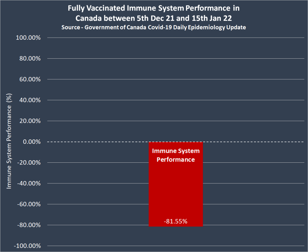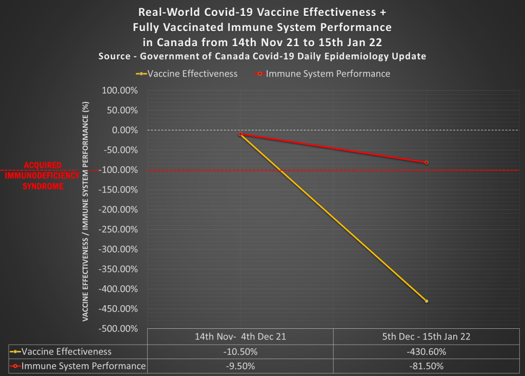 Niet alleen in Nederland, maar ook in Canada dreigt het op korte termijn helemaal mis te gaan bij gevaccineerden: officiële overheidscijfers suggereren dat de meesten inderdaad Vax-AIDS aan het ontwikkelen zijn nu hun immuunsystemen zijn gedegradeerd tot een gemiddelde van MIN 81%. (Zie ook ons artikel van 2 februari: (/ Canadese cijfers bevestigen pandemie van gevaccineerden: Effectiviteit Covid injecties blijkt niet de geclaimde 95%, maar MIN 425%).