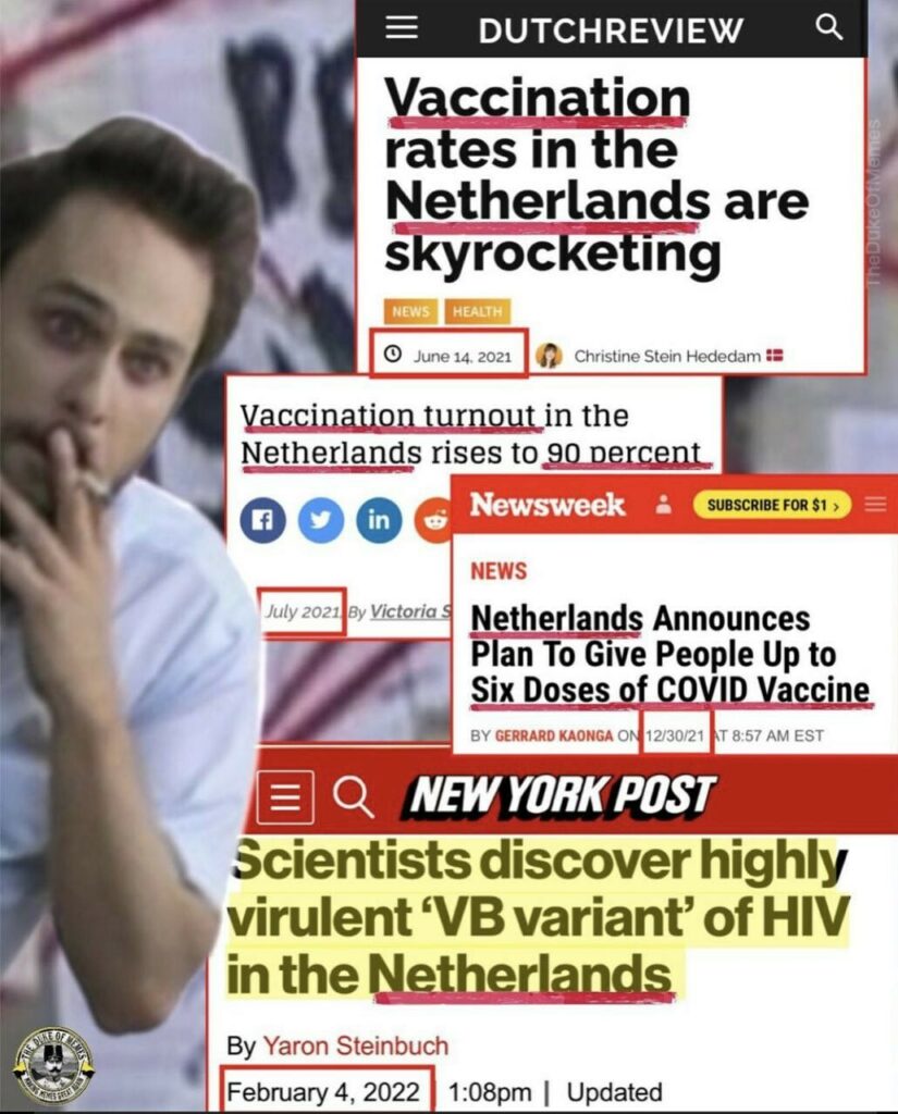 (Belangrijke aanvulling 08-02 onderaan). Herinnert u zich onze artikelen over het verband tussen de immuunsysteem ondermijnende Covid injecties en het ontstaan van een nieuwe vorm van AIDS? Wel, Amerikaanse media berichtten enkele dagen geleden dat wetenschappers een virulente ‘VB variant’ van HIV (‘super HIV’) in Nederland hebben ontdekt (1). Ons land staat aan de top staat van meest ‘gevaccineerde’ landen van Europa (in juli 2021 zou dat 90% zijn geweest, waarna dat percentage fors werd verlaagd, vermoedelijk om de aanhoudende lockdown- en andere maatregelen te kunnen blijven ‘rechtvaardigen’). Aangezien de injecties onaantastbaar en heilig zijn verklaard, kunnen we van de mainstream media de inmiddels zo voorspelbare onzinverklaring verwachten dat het allemaal de schuld is van een Covid variant, en er ‘dus’ snel nog meer ‘vaccinaties’ noodzakelijk zijn.
