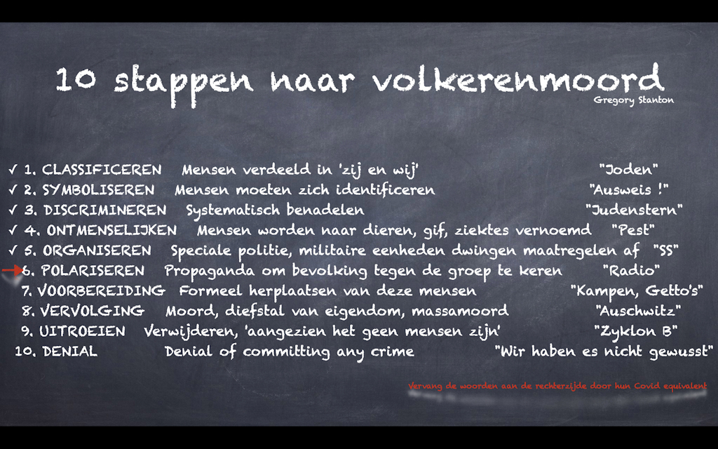 Destijds waren er wereldwijd 70 tot 80 miljoen doden en grootschalige verwoestingen voor nodig om de mensheid eventjes wakker te schudden en op een ogenschijnlijk rechter spoor te zetten. Die lessen werden al snel weer vergeten met tal van nieuwe oorlogen, en nu, sinds 2020, met een vrijwel 1 op 1 herhaling van wat de Nazi’s deden. Al gebeurt dat in een andere verpakking en met andere technologieën, gericht tegen andere ‘foute’ mensen, maar gebruik makend van exact dezelfde en verder geperfectioneerde valse voorwendselen die er met een ongekend breed en geavanceerd scala angst- en propaganda technieken in worden gepompt.