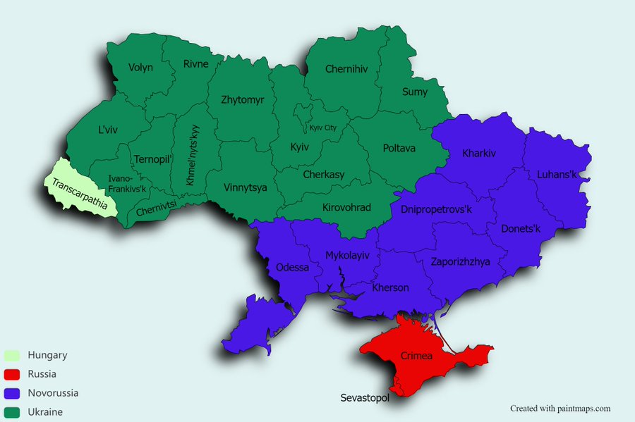 Een van de kaartjes die circuleren over een mogelijke opdeling van Oekraïne.