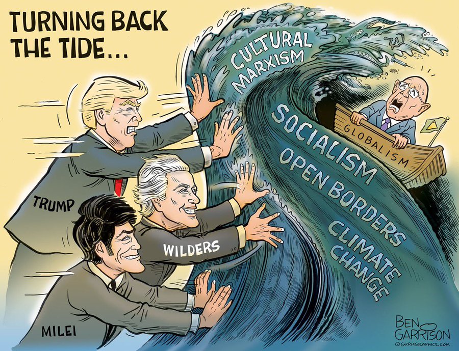 De bekende politieke cartoonist Ben Garrison maakte zelfs een cartoon van Wilders, die samen met Trump en Milei ‘het tij’ van de globalistische golf van Klaus Schwab (open grenzen, klimaatverandering, socialisme en cultureel marxisme) aan het keren is: