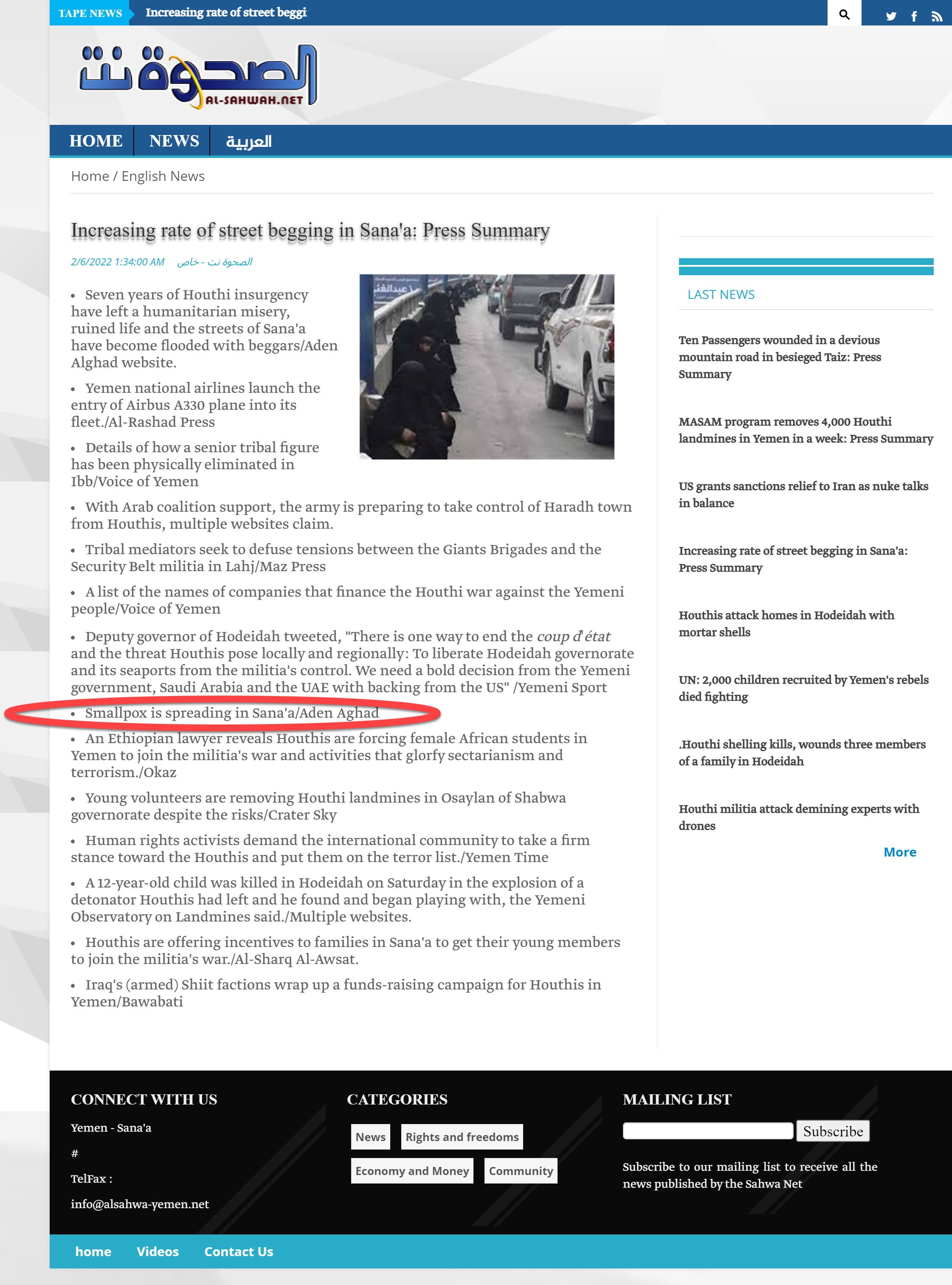 Overigens heeft de Arabische krant al-Sahwah in Jemen, opgericht in 1986 en een van de officiële media organen van de Al Islah partij, klaarblijkelijk nog steeds het bericht over de pokken uitbraak op zijn site staan: